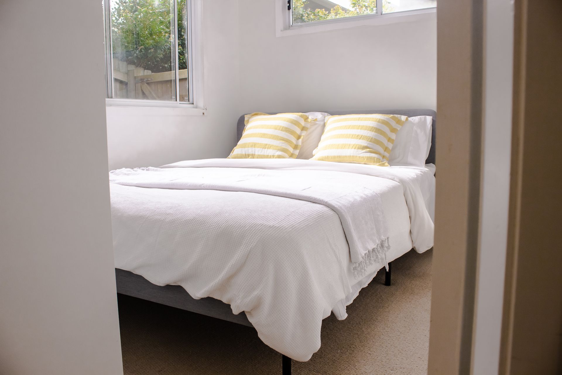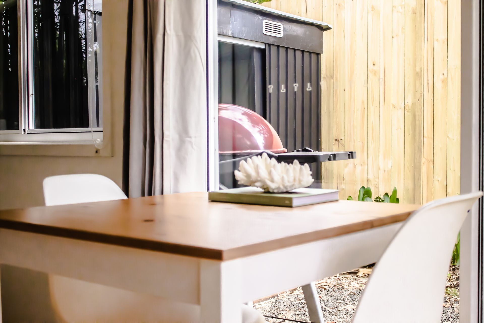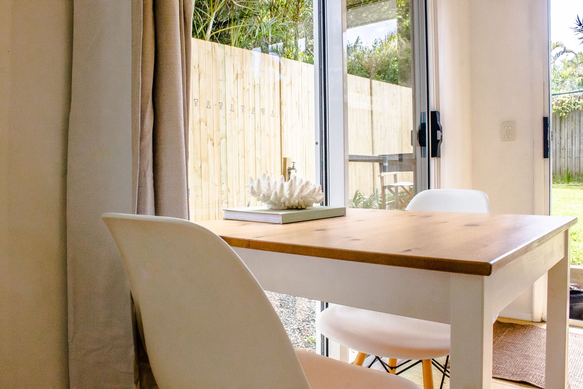 This gorgeous little apartment has two rooms, one with a queen bed and one with a double bed. It has a separate lounge area, a full kitchen with a cute garden area that is fully fenced.