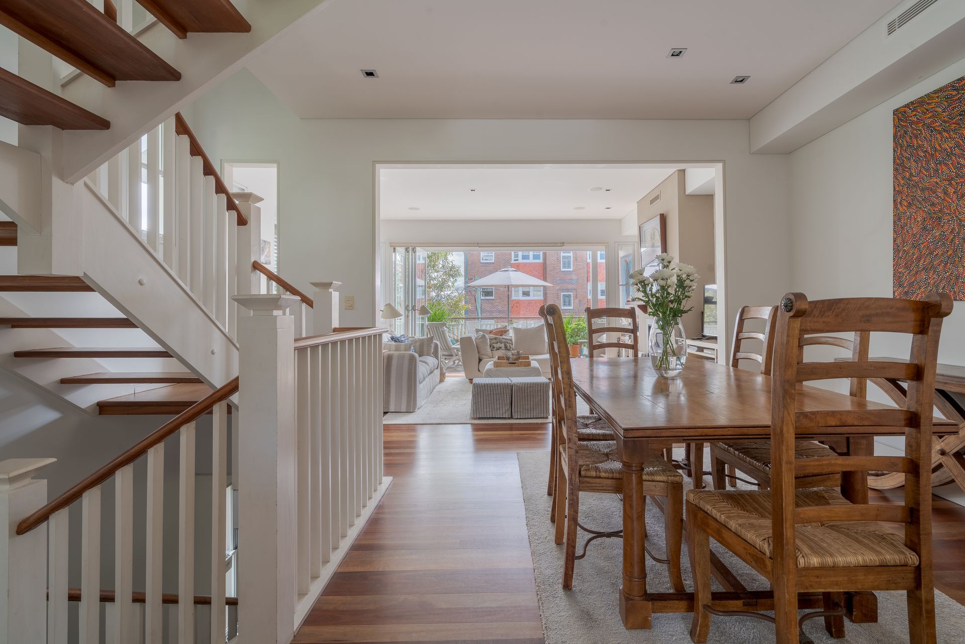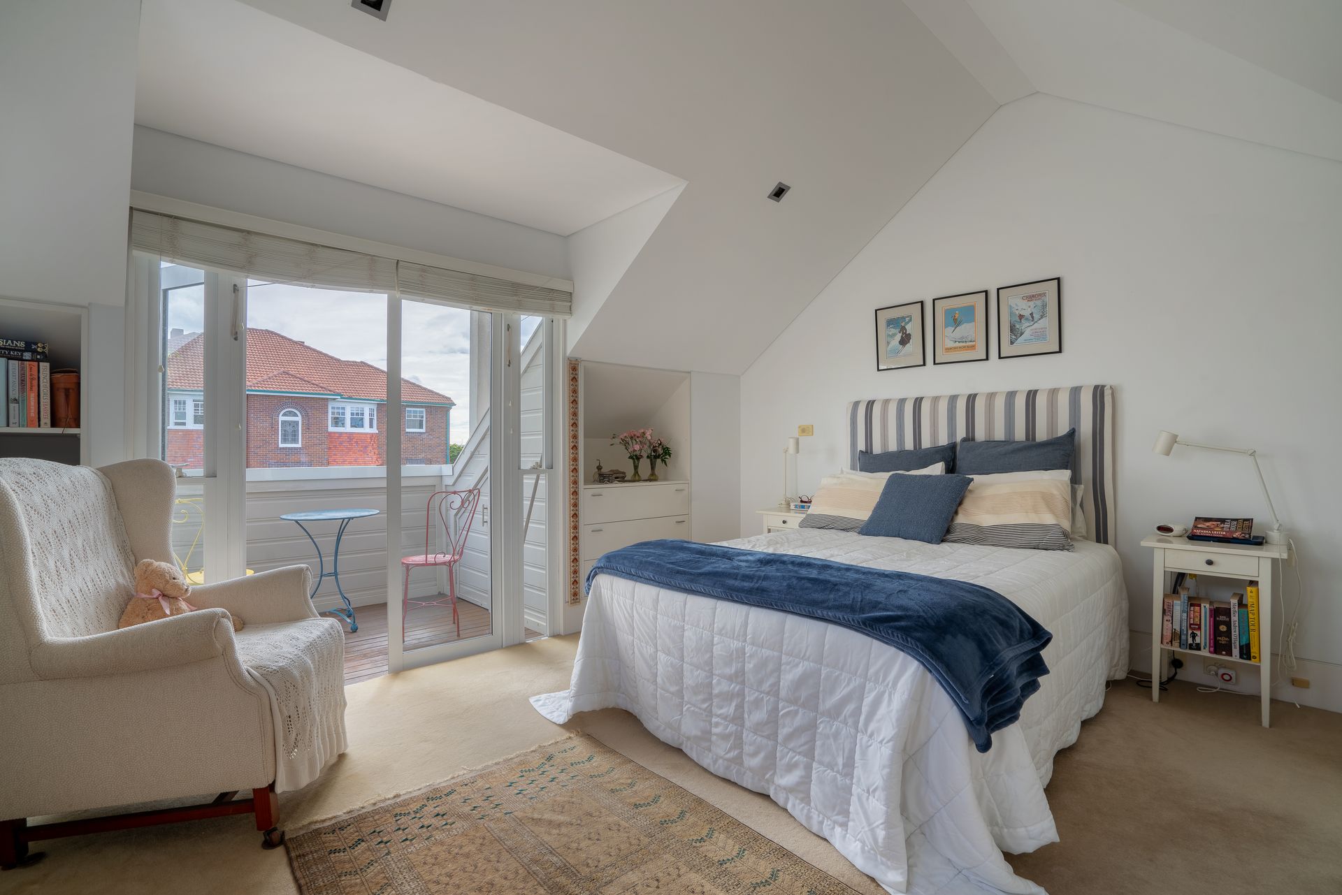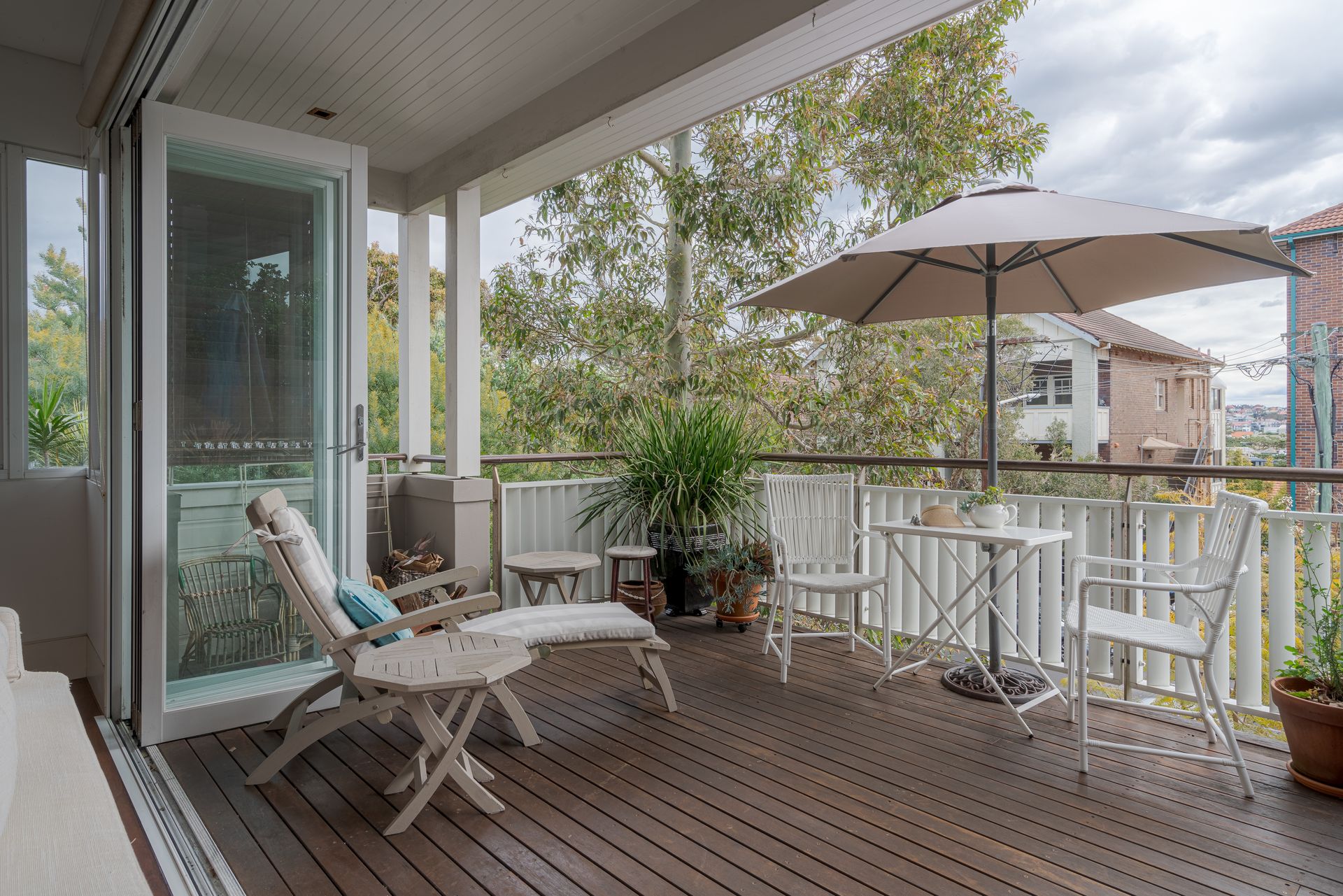 This is the living level, where fun, laughter and good food thrive! So this level is unique in that it goes from a cool enclosed rear verandah with lounge and Barbeque and concertina glass doors that connect the space with the kitchen. From the kitchen the stairs from the font door arrive into the dining area which merges to the living room with fireplace and then a second set of folding glass doors connect the whole space with the sun soaked front verandah with chairs, table, sun lounge and umbrella. Its a great space to linger over sunset drinks. All is private and belongs to the house. From level two you then climb the stairs to the attic bedroom and bathroom which also has its own very private verandah