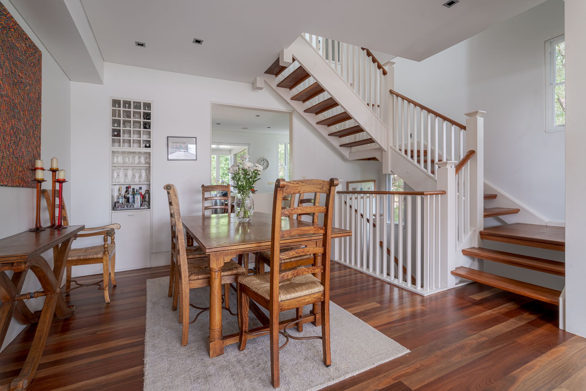 Club Cliff is a unique architect designed home on 3 levels. . On level one are 2 bedrooms, an office with single bed available, bathroom, laundry . All rooms open onto either a private verandah or the rear fenced garden which is heaven to sit in during the heat of summer and sip delicious cool drinks. From the front hall with its beautiful wooden floors the stairs invite you up to the second level.