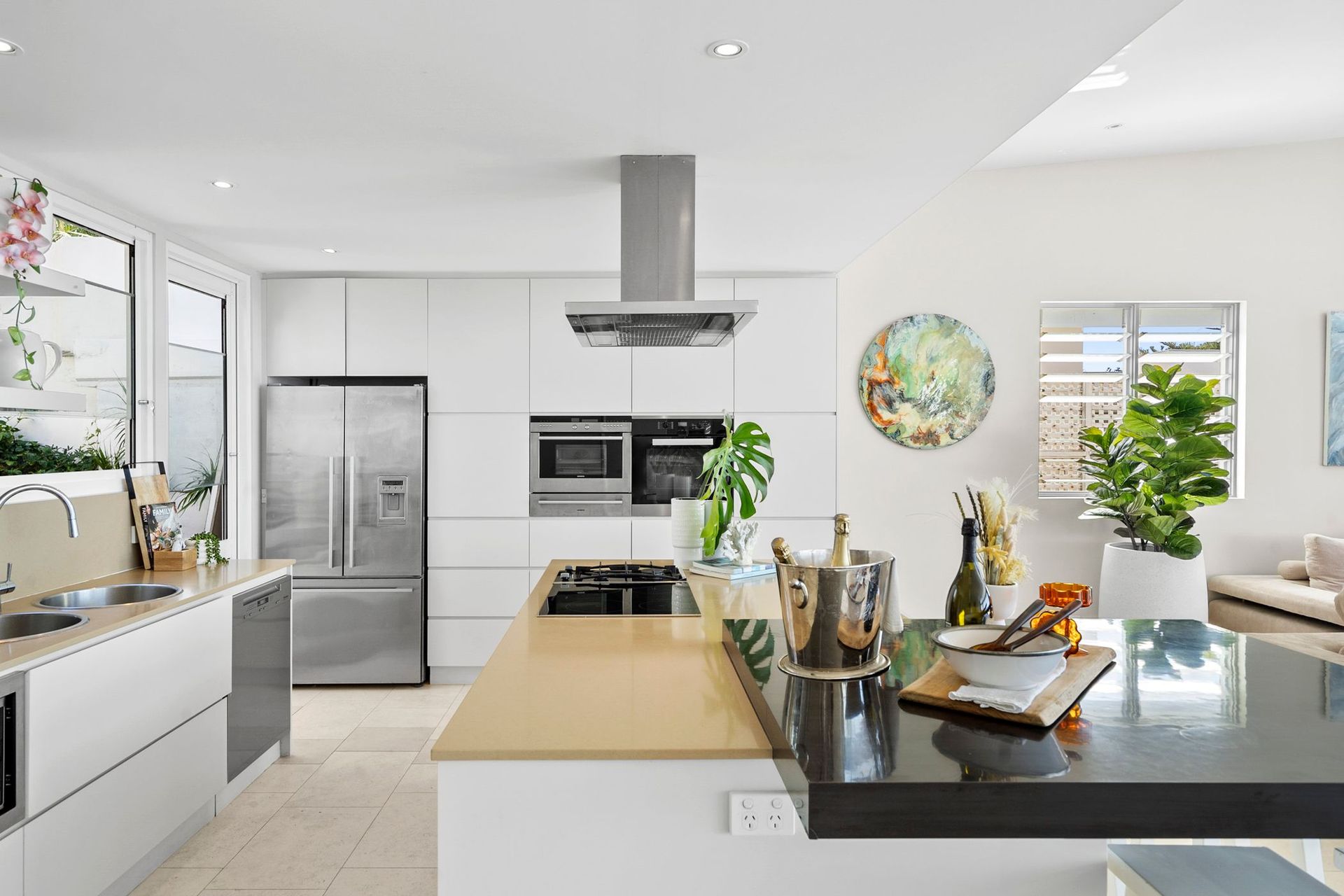 The modern perfectly appointed kitchen includes both induction & gas cooktop, double ovens, a large kitchen island bench with breakfast bar and a door which leads to a rear terrace and a Gym space.